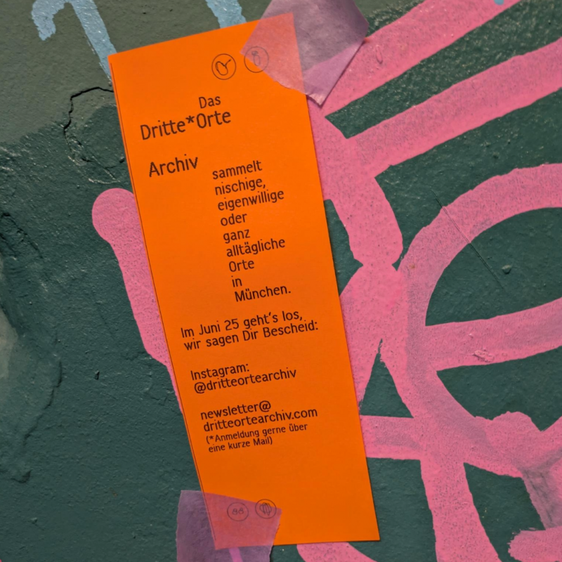 Anfang 2024 begann ich, im Verschwinden begriffene Orte über ihre Dinge, Atmosphären, Geräusche und Praktiken der Aneignung und Fürsorge zu konservieren. Aus dieser Praxis heraus habe ich im letzten Jahr gemeinsam mit den Gestalterinnen Carina und Marisa Müller (Studio MLLR) das Archiv mit seinen Bausteinen und Formaten entwickelt und meine Arbeitsweise für andere geöffnet. Im Frühjahr 2026 werten wir die "Pilotphase" aus und bereiten die nächste Phase vor. Hier können auch kleinere und größere "Satelliten“ in Kooperation mit ganz unterschiedlichen Menschen und Institutionen in München, aber auch in Dörfern, Gemeinden und Städten entstehen. In Zukunft soll es über München hinaus weiterwachsen. Meldet Euch gerne, wenn Ihr das Archiv einladen, kooperieren und Teil des Dritte*Orte Archivs werden wollt: hello@dritteortearchiv.com.