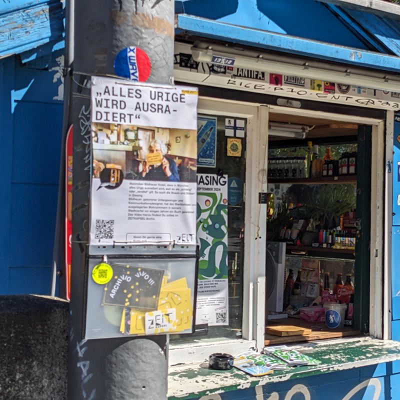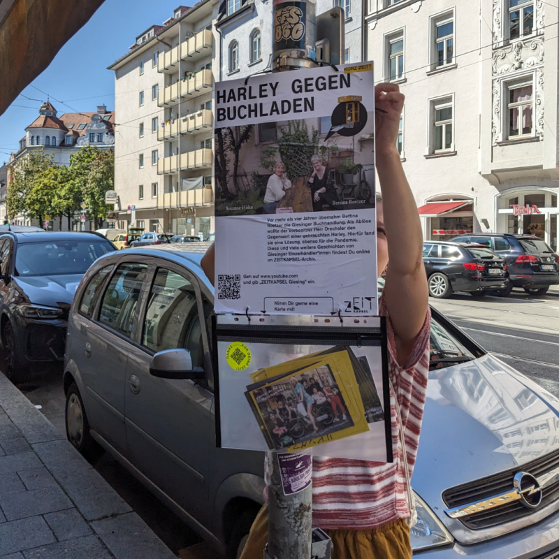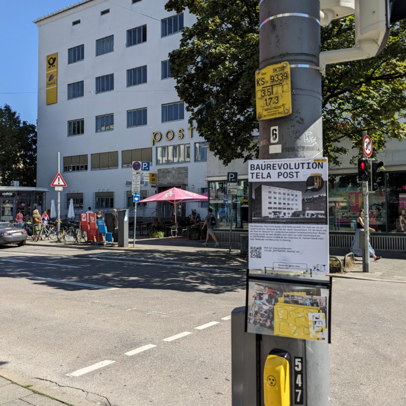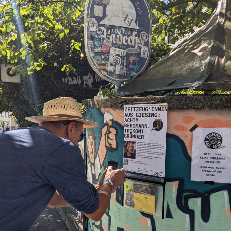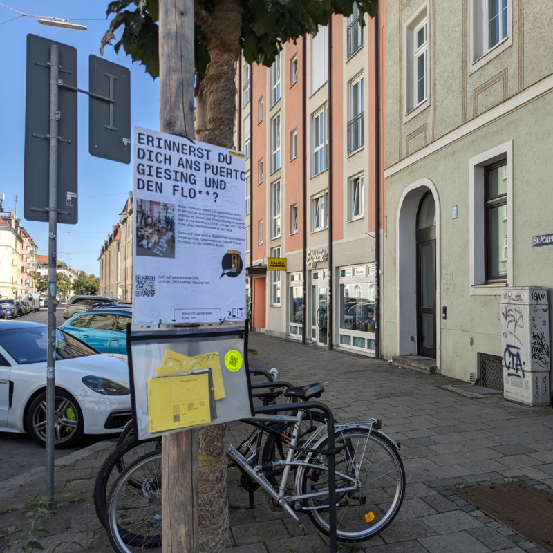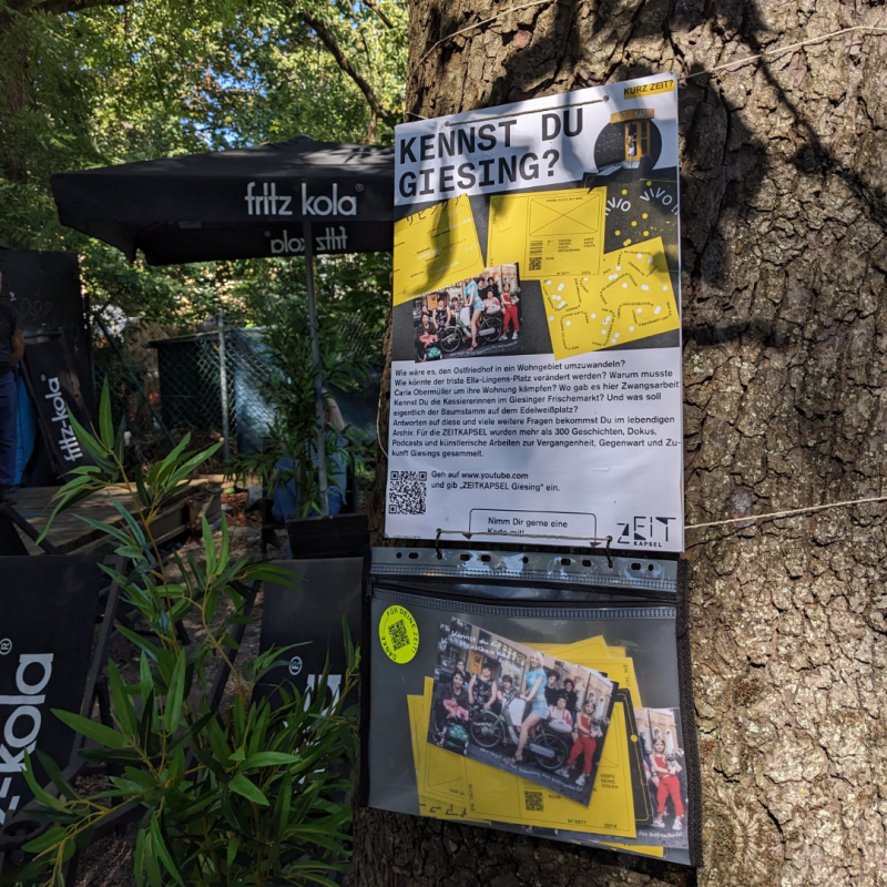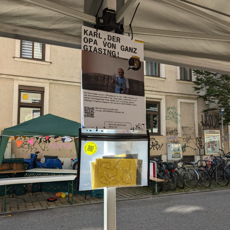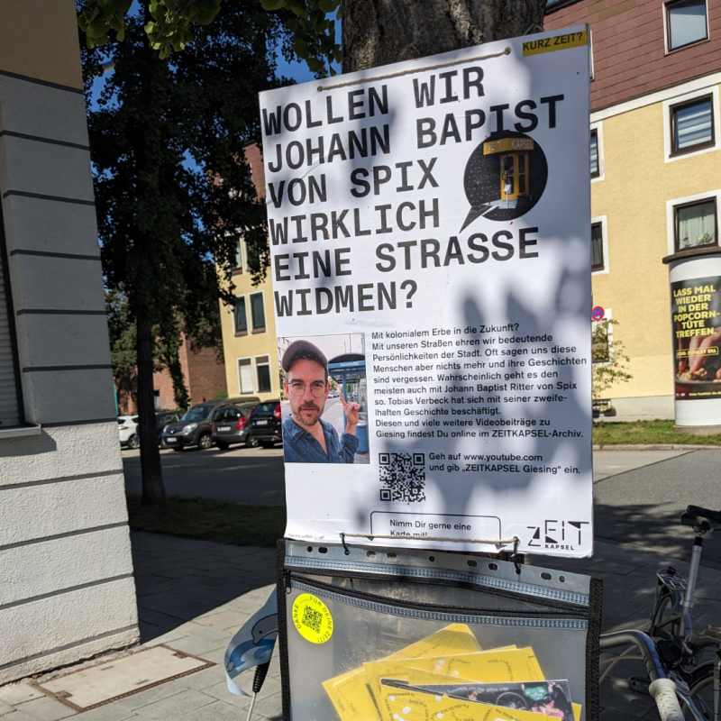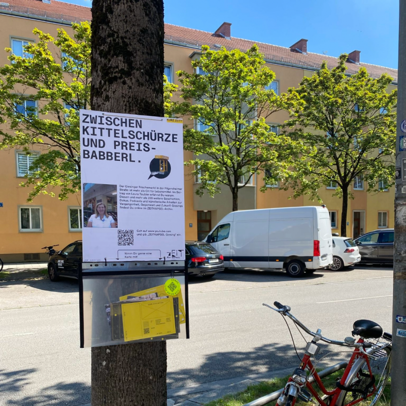 Diese wurden umfunktioniert, um im Rahmen eines großen Stadtteilfests (Ois Giasing) an mehreren Orten im öffentlichen Raum auf ortsbezogene historische und dokumentarische Arbeiten aufmerksam zu machen. Das sind audiovisuelle Beiträge, die im Rahmen der ZEITKAPSEL entstanden sind oder wieder zugänglich gemacht wurden. Etwa in der Spixstraße, die nach einem Kolonialherren benannt wurde oder vor der TeLa Post, die damals von den Nationalsozialisten fast abgerissen worden wäre.